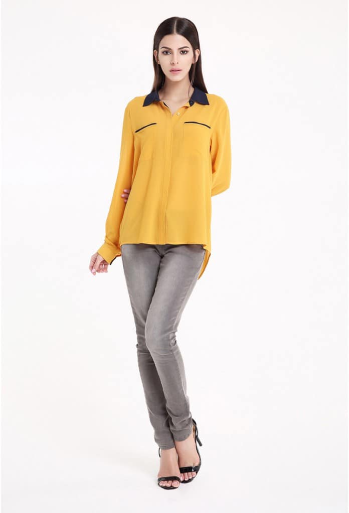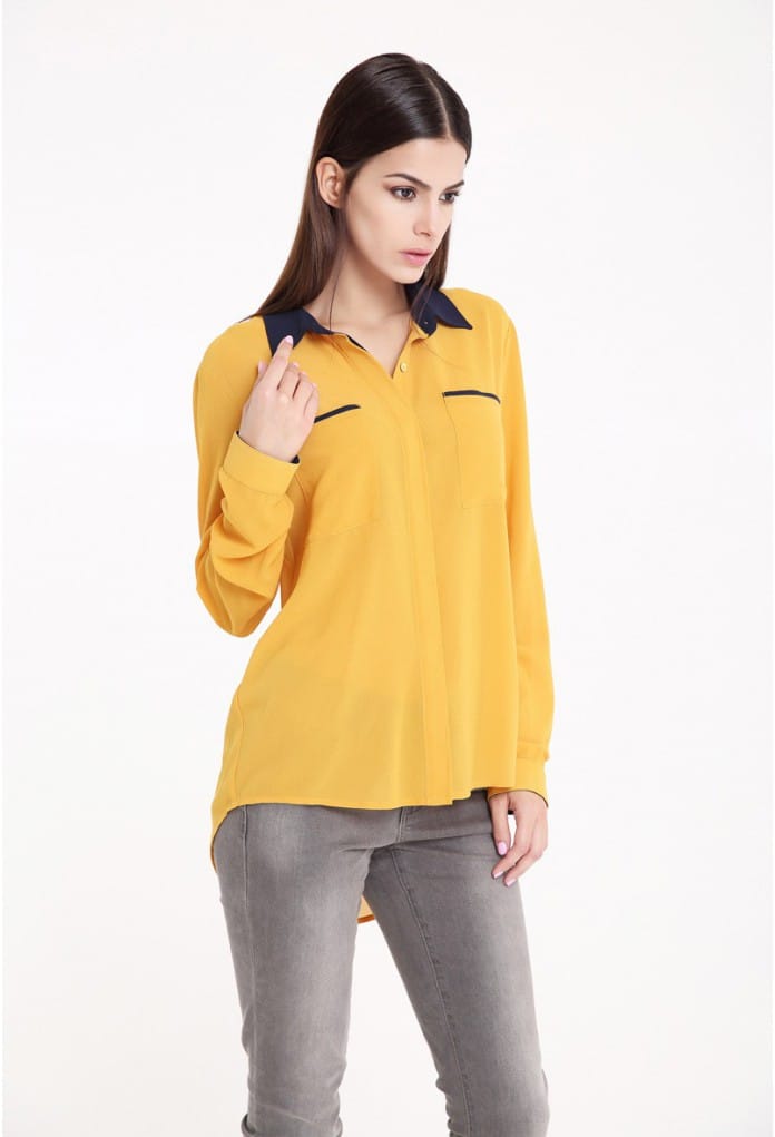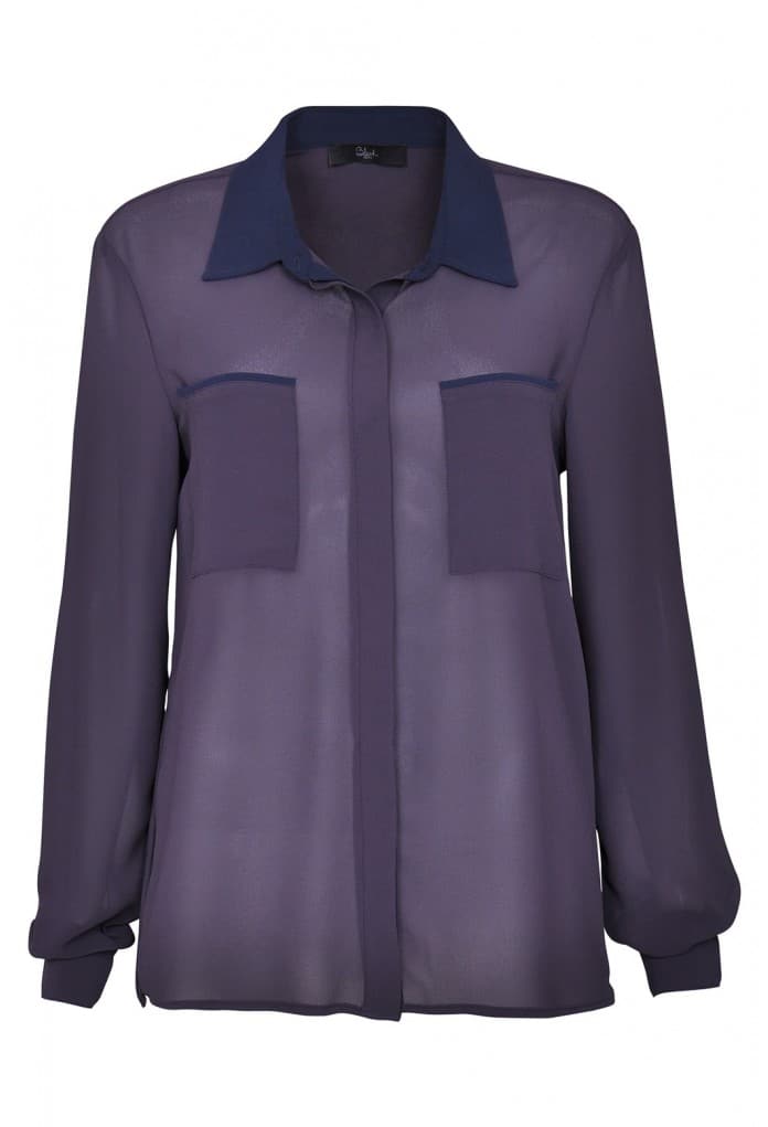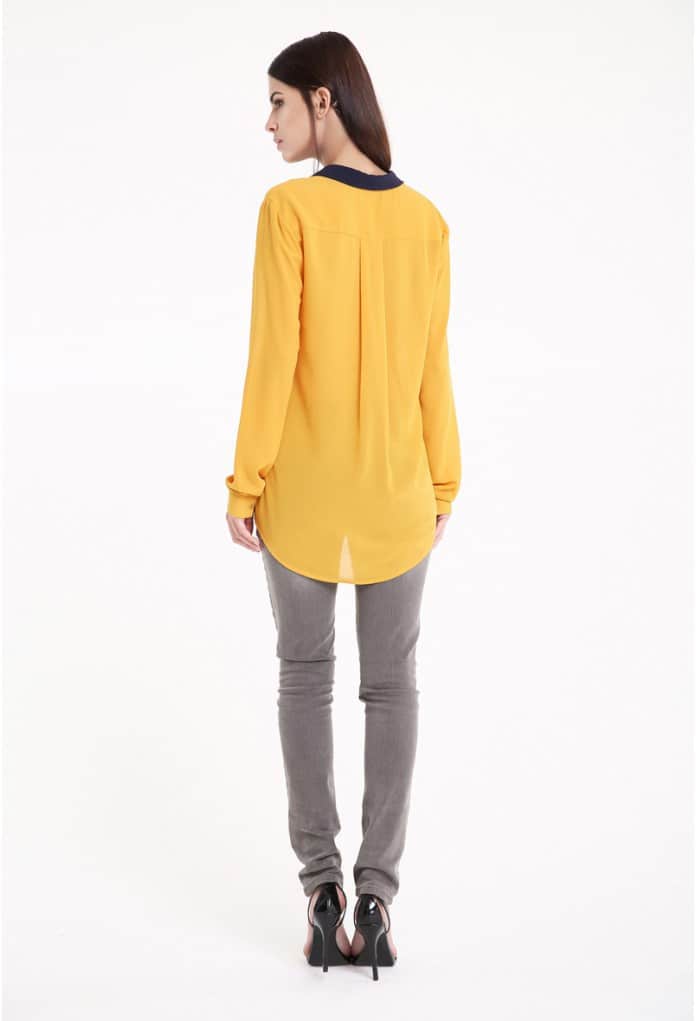 Chemisier bi-color à manches longues avec un col noir et deux poches sur la poitrine.